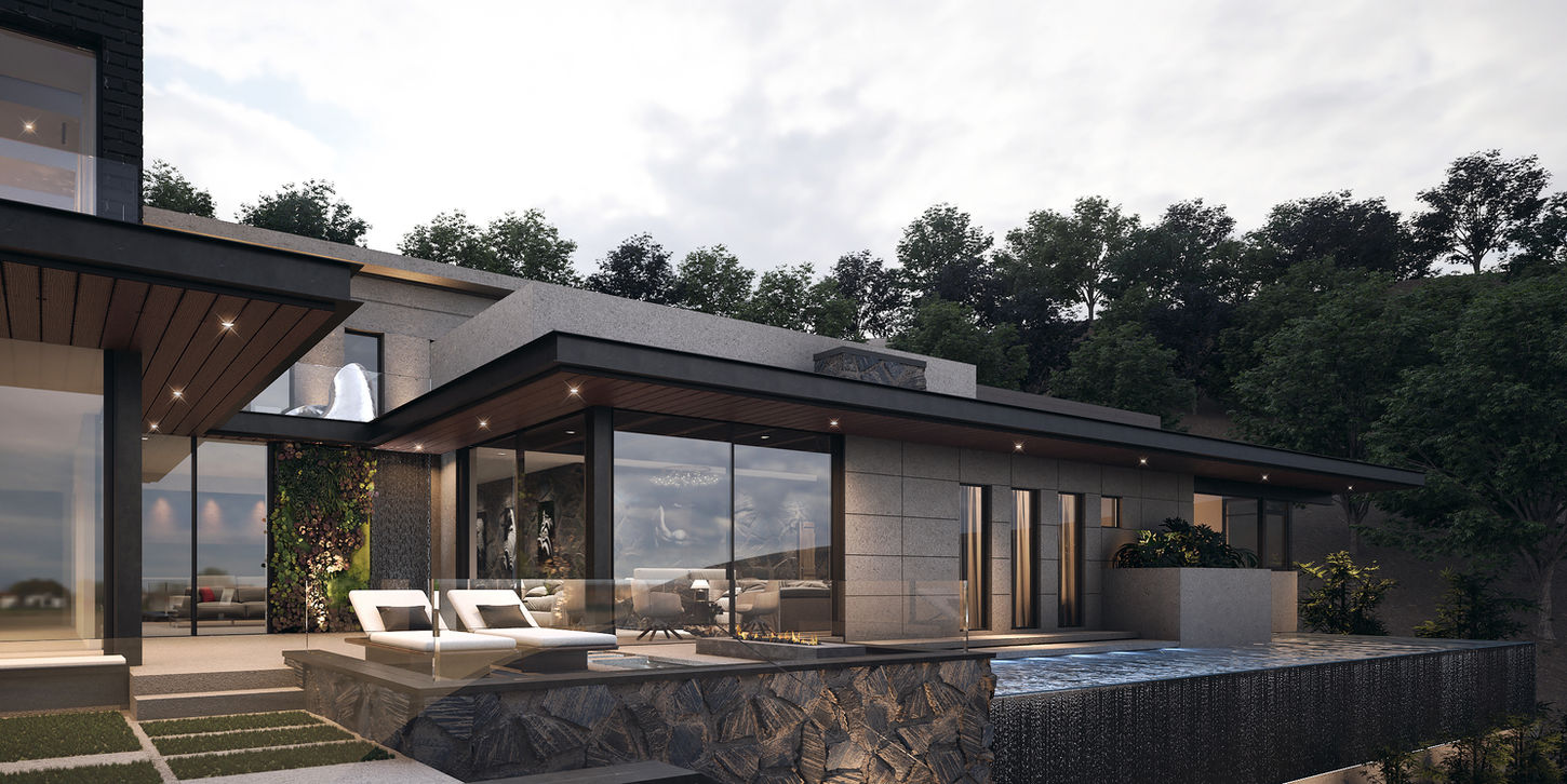 Located on a fairly steep terrain in the hills of Los Angeles, CA, this single family residence provides a serene environment away from the city allowing an ambition artist to focus on creating. Modern forms in conjunction with the natural textures used throughout engages the senses of sight, smell, touch, and hearing. The residence is equipped with a water recycling unit that feeds the interior spaces and the rear pool area. For energy efficiency, 85% natural day lighting is utilized accompanied with solar panels anchored to the roof.